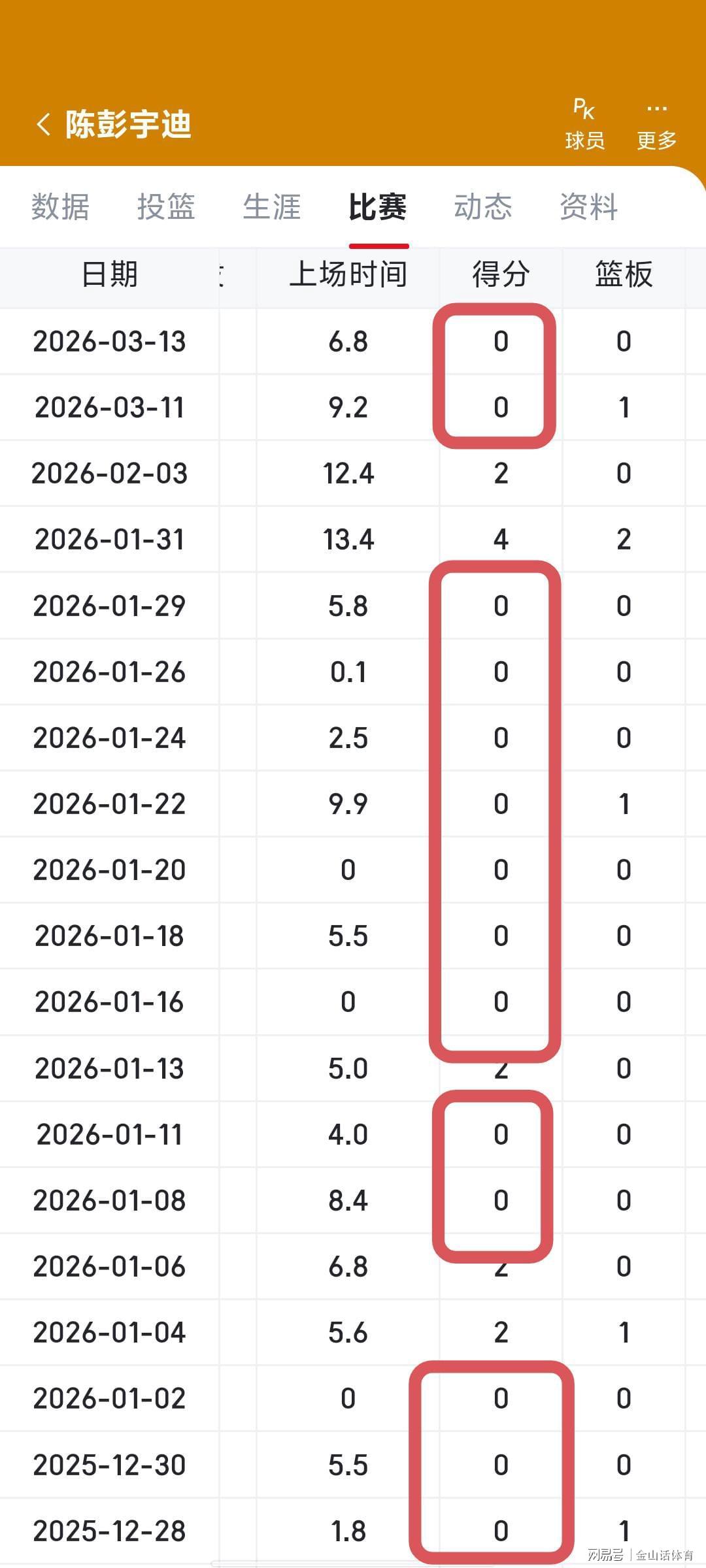 截止目前,陈彭宇迪本赛季的数据为,场均1分0.5板0.9助攻0.3助攻0.6失误1.7犯规,他的投篮总命中率为23.8%,三分命中率为10%。然而,就这样一个平庸之辈,陈彭宇迪还隔三差五进首发名单,本赛季已5次进入先发五虎名单了。