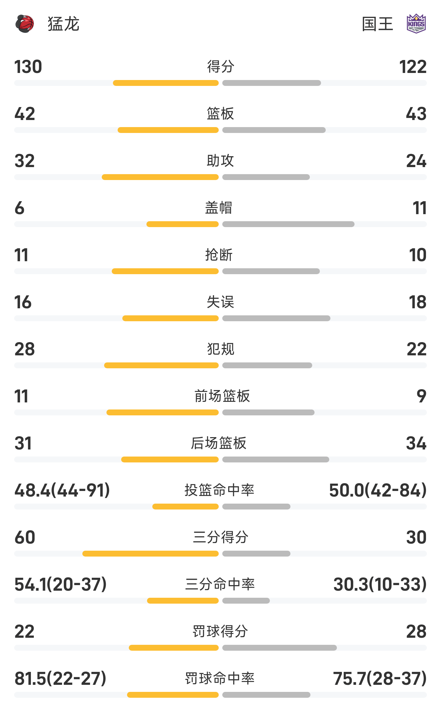 10月09日讯 25/26赛季NBA 季前赛,国王对阵猛龙。双方全场战罢,国王122-130不敌猛龙。英格拉姆砍下全场最高的21分6板3助,率领猛龙成功取胜。